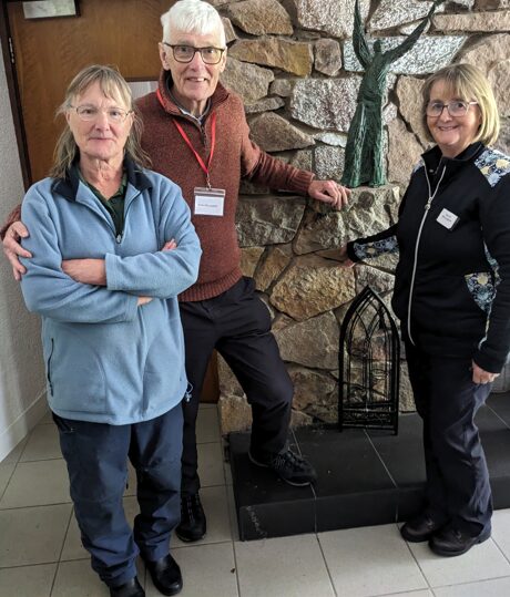Jan with Corrymeela members Brian and Marian McLoughlin in the Croi at Corrymeela (with bronze statue of St Francis and the Birds by John Behan)