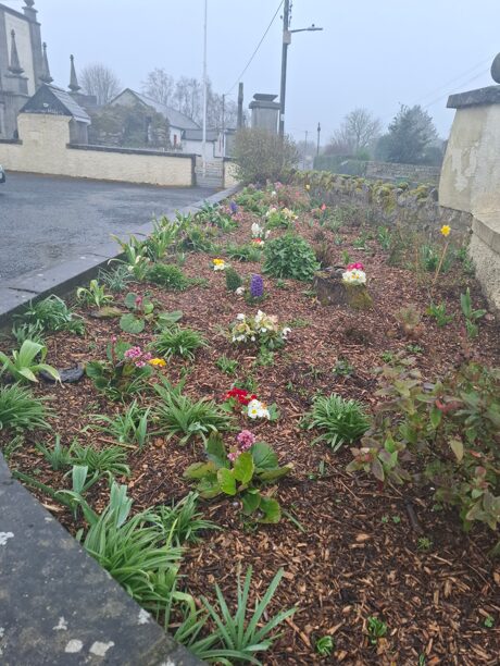 A plan was put together to remove all the old shrubbery and replace it with pollinator Spring and Summer bedding. Members of the local community and those on the CEC scheme dug up the old shrubs which was followed by adding soil conditioner and compost to the soil. In late Autumn a planting scheme was designed which included an array of Spring bulbs and plants. These include snowdrop, tulip, primula, hyacinth, Hellebores and Bergenia. The vibrant display has added a welcome burst of colour to the carpark after the dreary wet months of late winter.